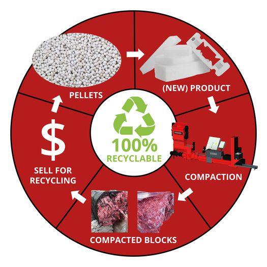 Die komprimierten Blöcke aus unvernetzten EPE-Schaumstoffabfälle sind als Rohstoff wieder verwertbar und können granuliert und recycelt werden, so werden aus Abfallkosten Rohstoffeinnahmen. Außerdem spart das Verpressen von EPE Lager- und Transportkosten ein, und auch die manuelle Arbeit bei der Handhabung des sperrigen Materials wird deutlich reduziert.