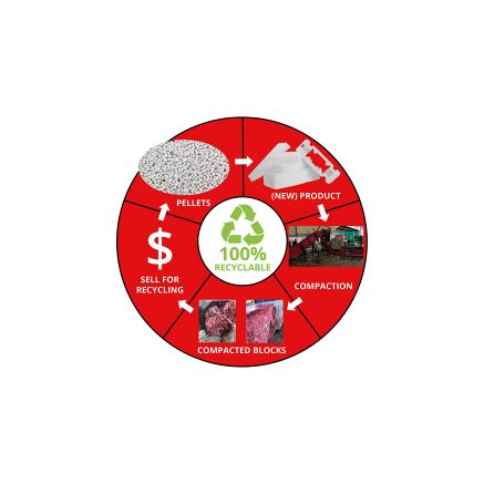 Die komprimierten Blöcke aus unvernetzten EPE-Schaumstoffabfälle sind als Rohstoff wieder verwertbar und können granuliert und recycelt werden, so werden aus Abfallkosten Rohstoffeinnahmen. Außerdem spart das Verpressen von EPE Lager- und Transportkosten ein, und auch die manuelle Arbeit bei der Handhabung des sperrigen Materials wird deutlich reduziert.
